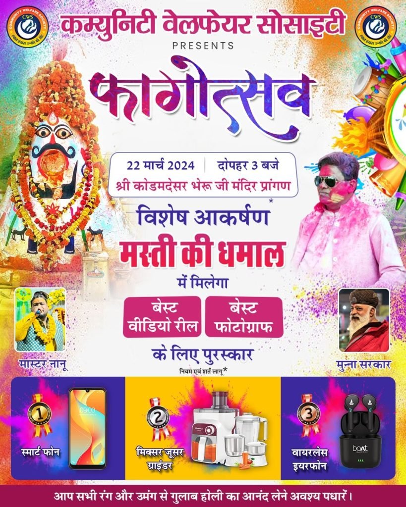 दिया जाएगा,ताकि लोगो मे आनंद के साथ साथ उत्साह भी बना रहे।संस्थान के अध्य्क्ष कन्हैया लाल भाटी ने बताया कि CWS द्वारा फगोत्सव का कार्यक्रम पिछले 4 साल से लगातार सफल आयोजन किया जा रहा है,ओर आगे भी जारी रहेगा।इसमें लोगो का आपार स्नेह मिल रहा है।