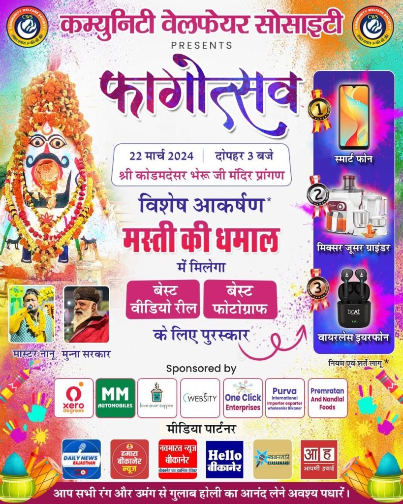 DNR News बीकानेर। आज कोडमदेसर भेरू जी मंदिर में कम्युनिटी वेलफ़ेयर सोसाइटी द्वारा फागोत्सव का कार्यक्रम रखा गया है,जो की आज शाम 3 बजे सुरु होगा,जिसमे आप सभी होली के रशिये,बाबे के भक्तगण सादर आमंत्रित है,
